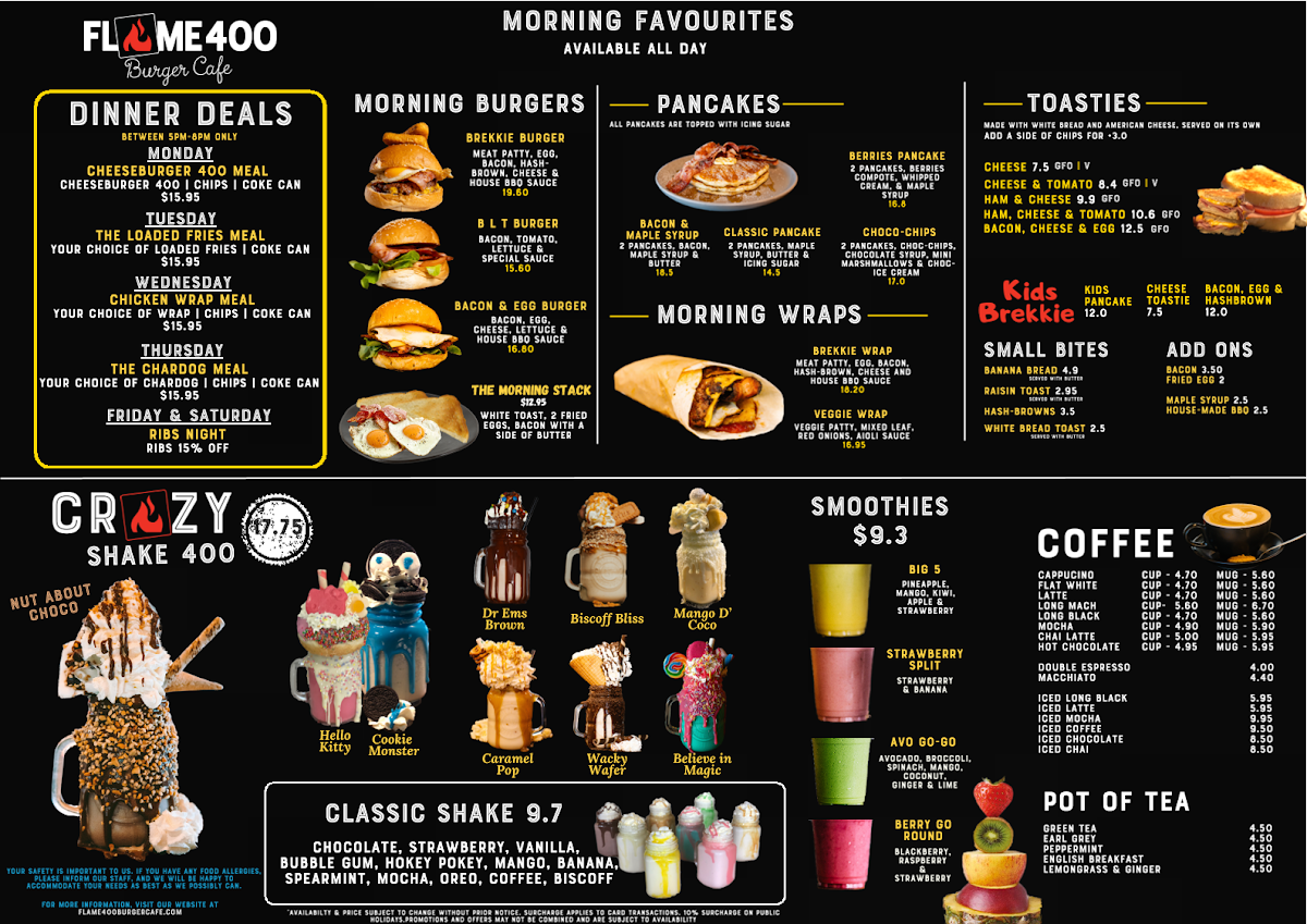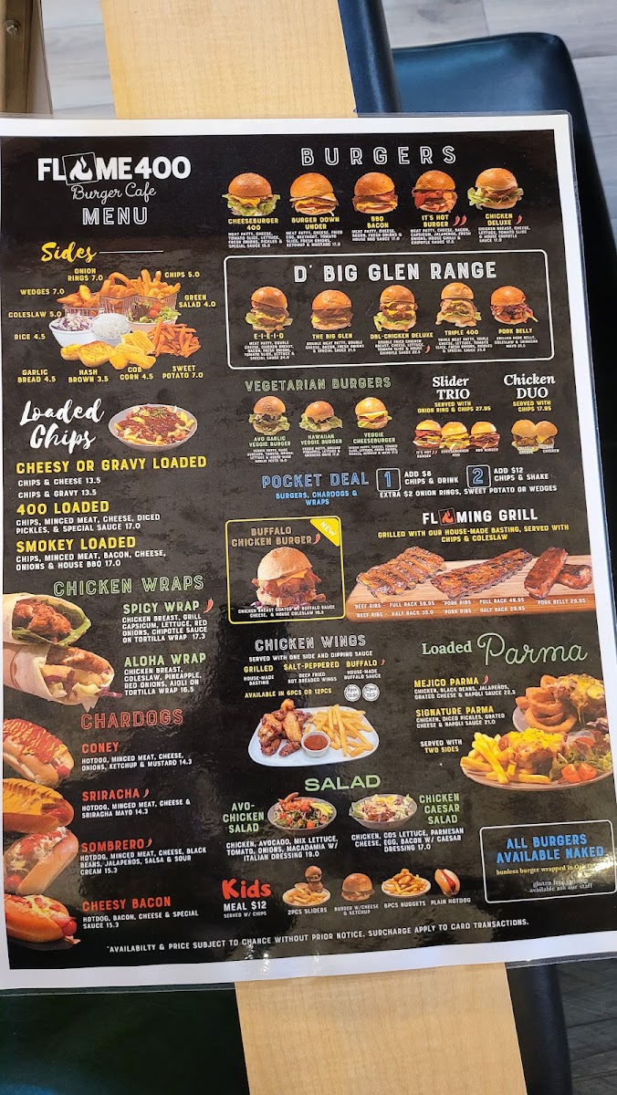 Welcome to Flame 400 Burger Cafe, a delightful spot in Mirrabooka, specializing in mouthwatering hamburgers and char-grilled selections. The menu is a feast for the senses, boasting juicy burgers alongside standout dishes like the Buffalo Wings and Full Rack Beef Ribs, which come perfectly paired with chips and coleslaw for A$69.95.